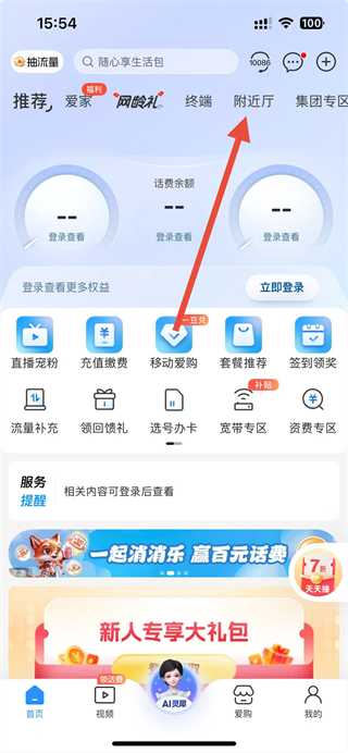 1、打开中国移动app,在首页顶部的导航栏中找到附近厅选项并点击,进入附近营业厅页面。