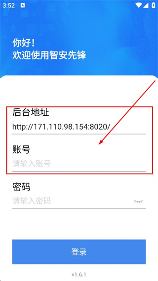 2、在智安先锋登录页面,填写后台地址对应的内容,再填写账号对应的信息。