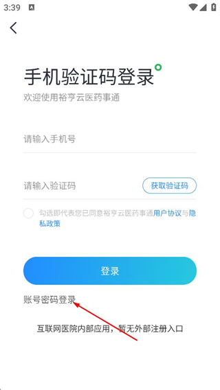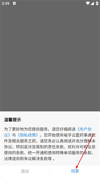 1、在温馨提示弹窗中,点击同意,进入裕享云医药事通的验证码登录页面。