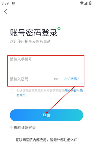 3、在账号密码登录界面,填写手机号和密码,点击登录,完成账号登录操作。
