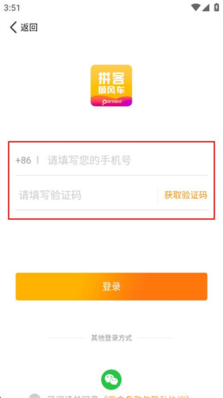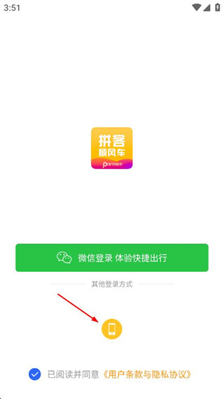 1、打开拼客顺风车软件,点击页面里的手机图标,进入手机号登录对应的页面。