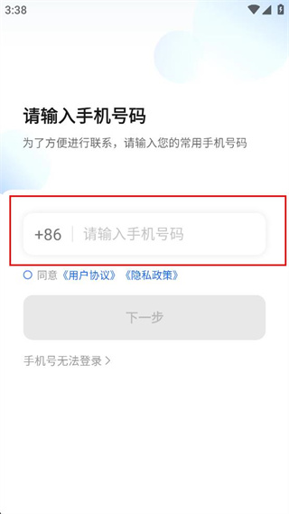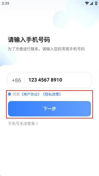 2、进入请输入手机号码页面,在号码输入框填写常用手机号码,勾选同意协议选项。