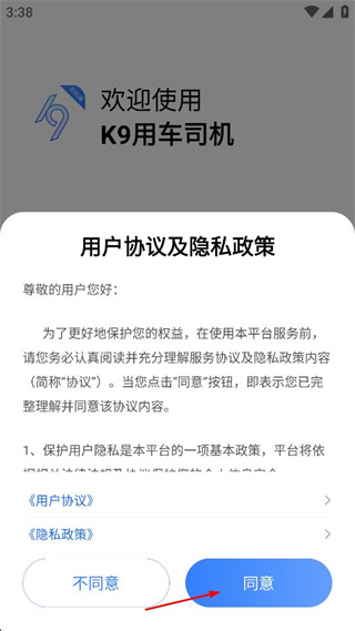 1、打开K9用车司机软件,在弹出的用户协议及隐私政策窗口中,点击同意按钮。