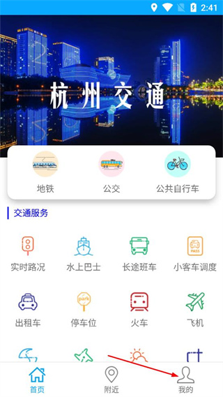 1、打开杭州交通软件,点击首页底部的我的选项,进入我的页面。