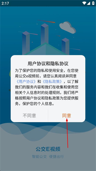 1、打开公交E视频,查看用户协议和隐私协议内容,点击同意按钮,完成协议确认步骤。