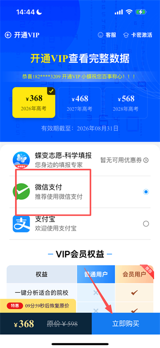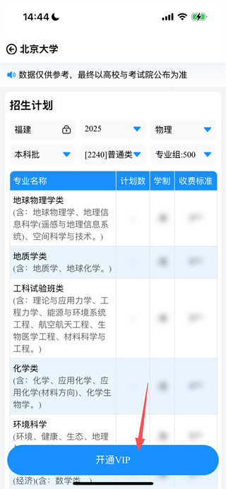 4、在开通VIP页面完成开通操作,即可查看北京大学的招生计划。