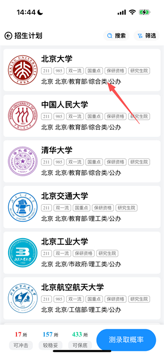 2、在招生计划页面选择北京大学,进入北京大学招生计划详情页。