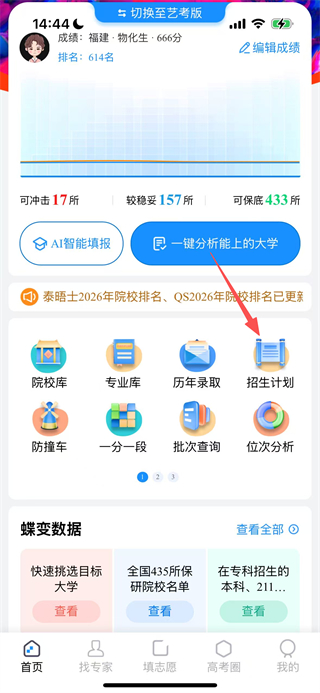 1、在首页点击招生计划选项,进入招生计划院校列表页面。