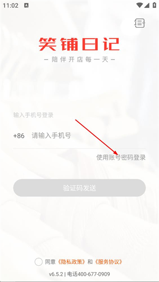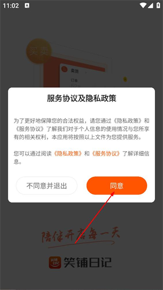 1、在服务协议及隐私政策弹窗中,点击同意,进入笑铺日记的登录页面。