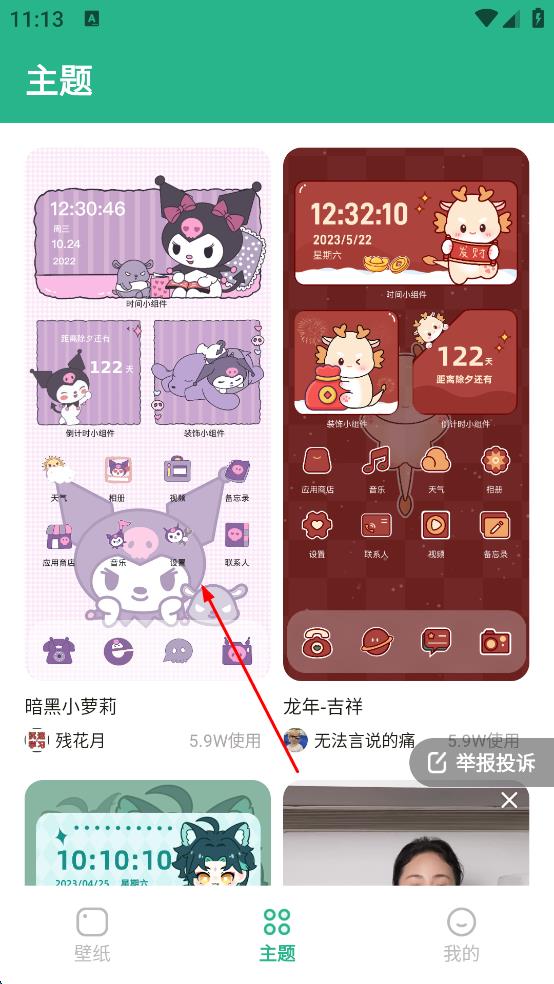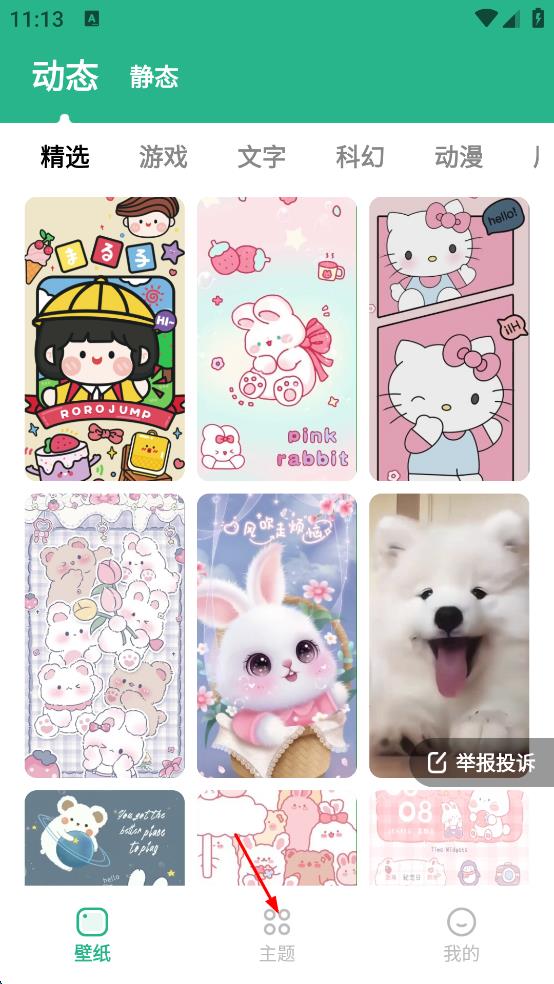 1、打开壁纸软件,在底部导航栏找到“主题”选项并点击,进入主题展示页面,可看到多种风格的主题,如带有卡通形象的主题等。