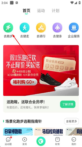 1、打开咕咚APP首页,点击底部发现,进入发现页面。