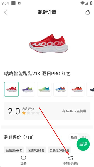 5、在跑鞋详情页面点击添加到鞋柜,即可完成跑鞋添加操作。