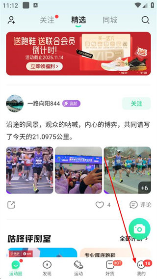 3、进入精选页面,查看会员年卡优惠信息,浏览用户发布的运动动态,如边大卫的夏训训练日志,点赞评论互动,还能查看咕咚评测室的运动装备评测,选购好货。