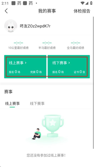 3、通过线上赛事、线下赛事分类,查看已报名、完赛的赛事记录。