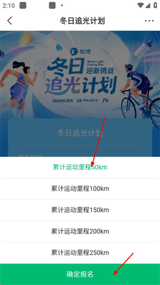 3、在报名页面选择参与的里程目标,点击确定报名完成活动参与。