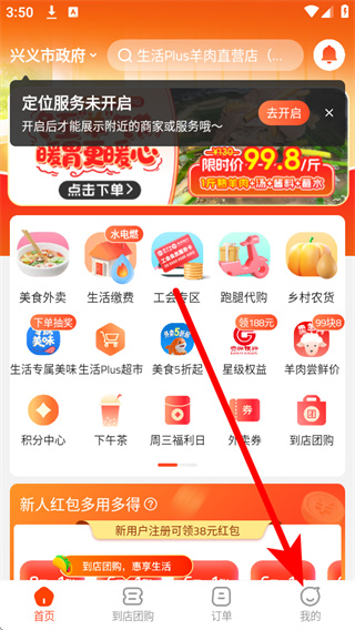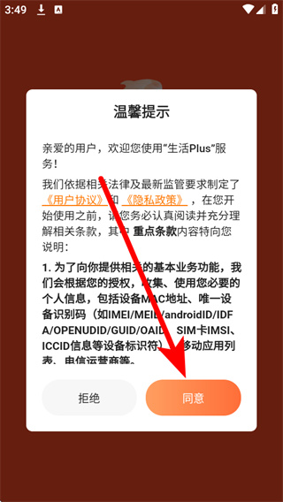 1、打开生活Plus,进入后弹出弹窗,点击同意,进入应用首页。