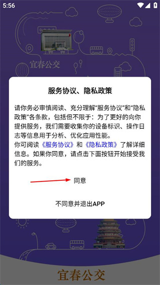 1、打开宜春公交APP,查看弹出的服务协议及隐私政策,点击同意按钮进入首页。