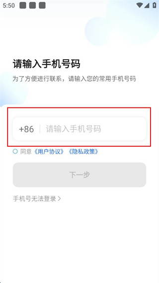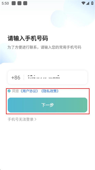 1、进入请输入手机号码界面,填写个人常用的手机号码,找到同意相关协议的选项并勾选。