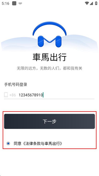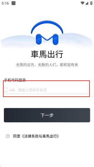 3、在手机号码登录界面,输入常用的手机号码,找到同意相关法律条款的选项并勾选。