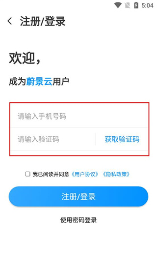 3、在注册/登录界面输入手机号码,点击获取验证码并填入收到的对应验证码。