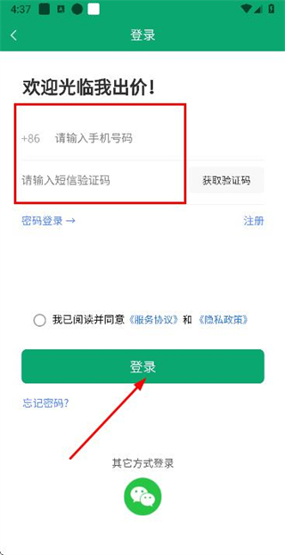 3、在登录页面填写手机号和验证码,勾选协议后,点击登录完成账号登录操作。