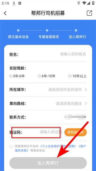 3、在司机招募页面,依次填写基本信息,点击获取验证码。