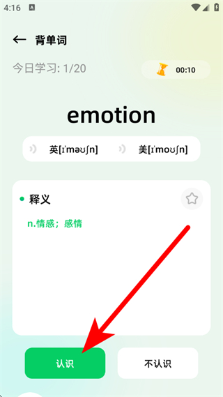 3、查看单词,根据自身掌握情况,点击认识或不认识,完成该单词的学习。
