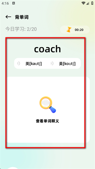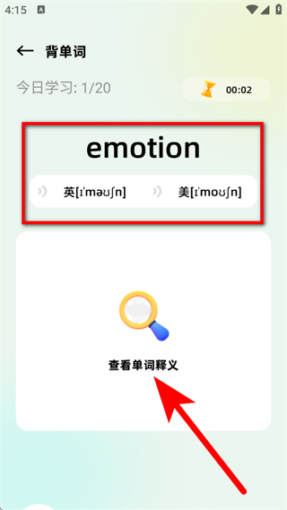 2、在背单词页面,点击查看单词释义,查看该单词详情。