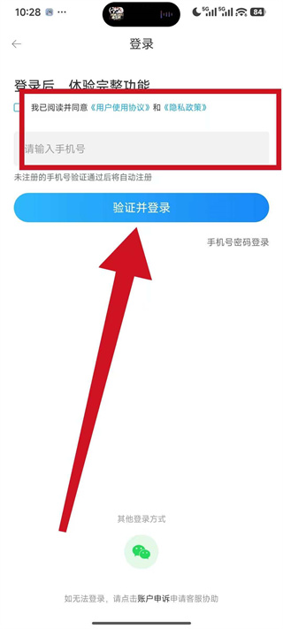 4、在手机号登录页面,先勾选相关协议,在输入框填写手机号码,随后点击验证并登录。