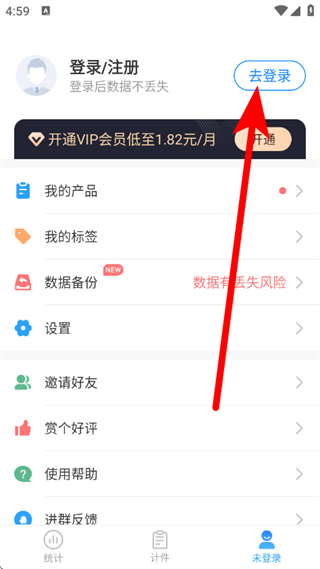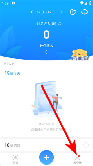 1、在安心计件,点击底部的未登录,进入登录注册页面。