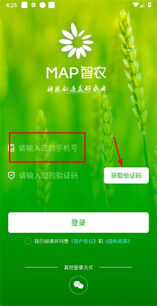 2、在登录页面填写手机号,勾选协议后,点击获取验证码。