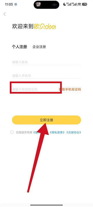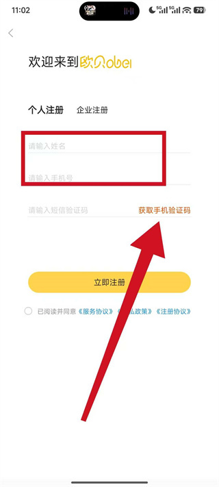 3、在个人注册页面,先在姓名框填写个人姓名,再在手机号框填写自己的手机号码。