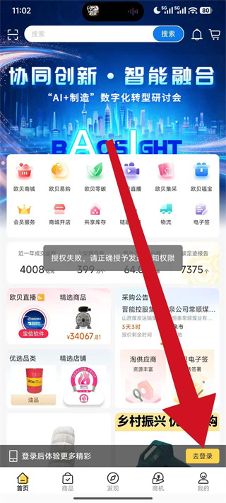 1、打开欧贝采购平台,进入首页后点击底部的去登录,进入账号登录页面。