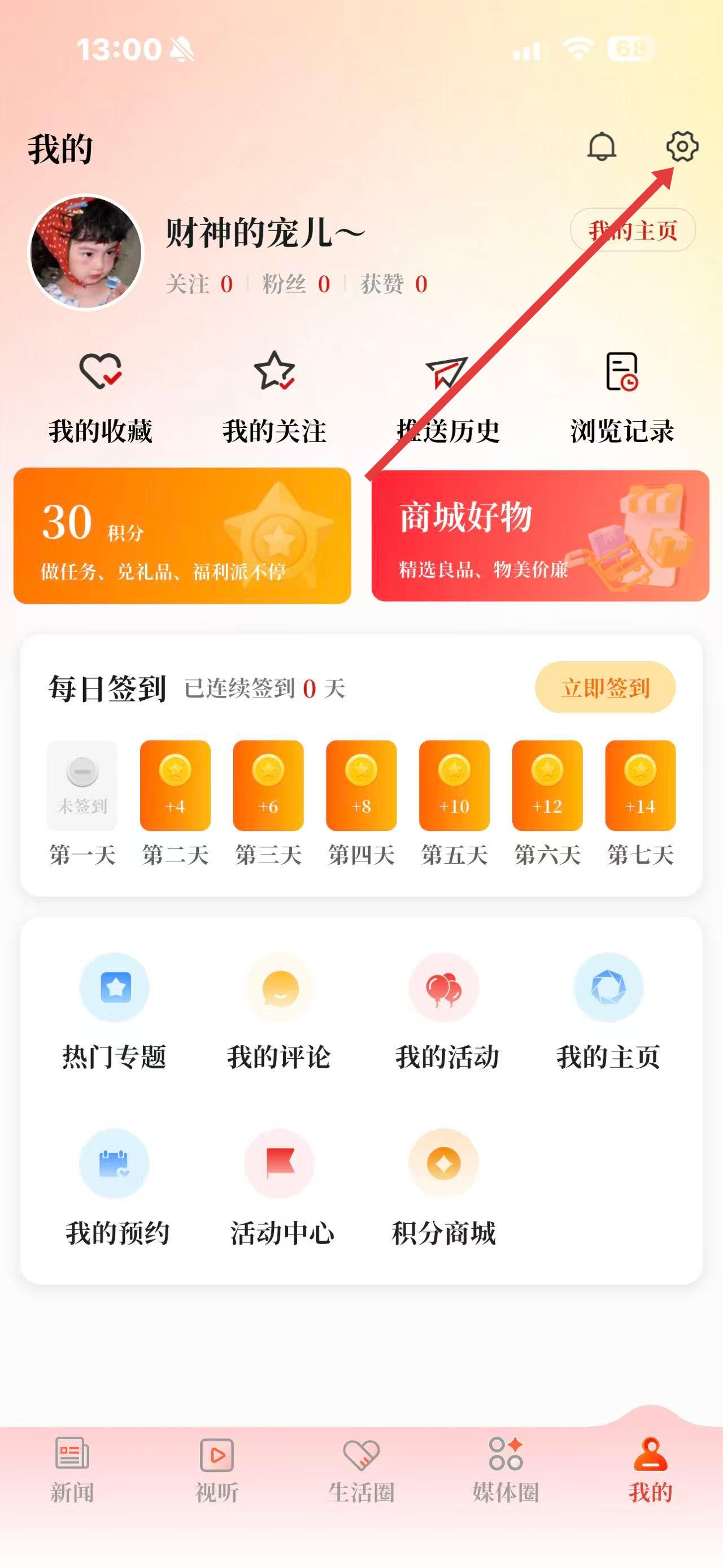 2、进入我的页面后,点击右上角的设置齿轮图标进入设置界面。