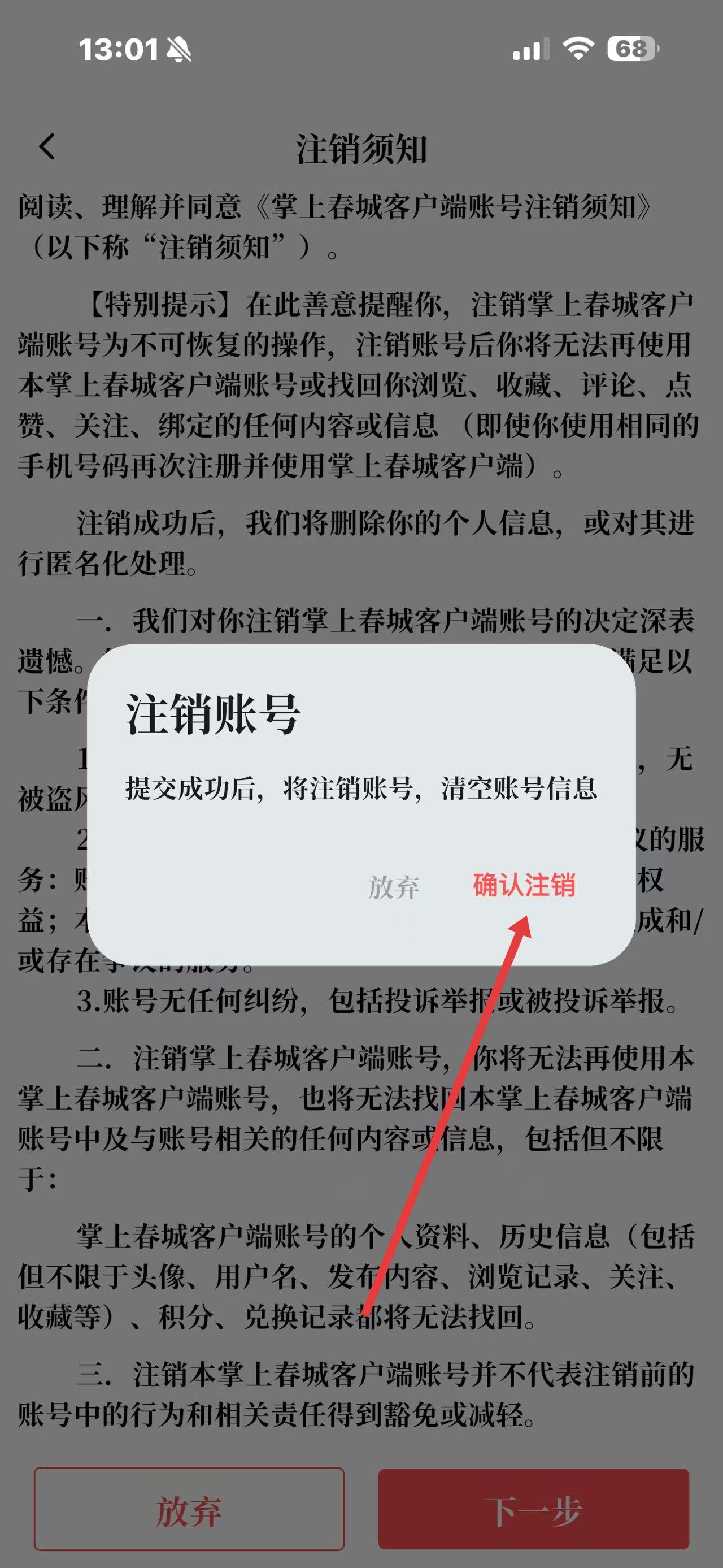 4、仔细阅读注销须知,确认后在弹出的提示框中点击确认注销完成账号注销。
