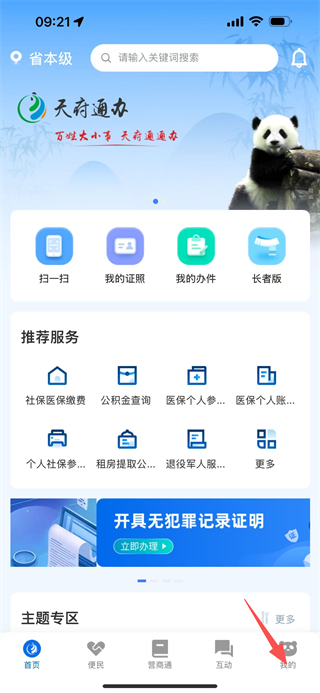 2、在天府通办首页,点击底部导我的选项,进入个人中心页面。