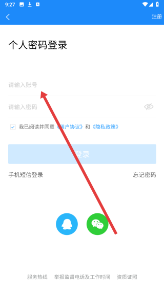 3、在勾选完同意按钮后,可以点击账户密码登录按钮,切换登录方式。