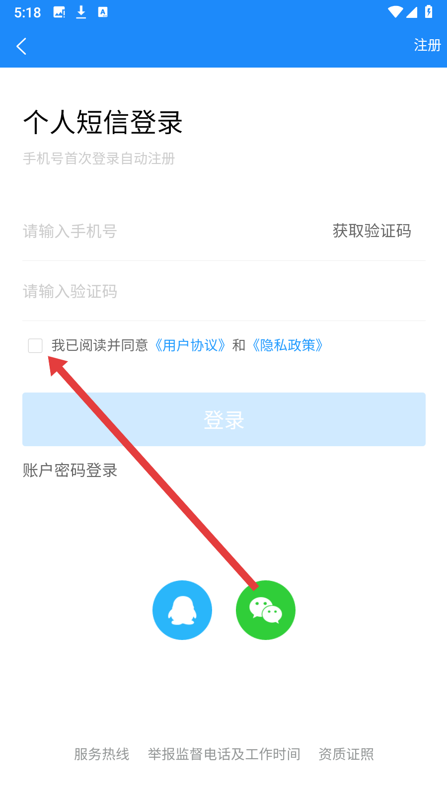 2、在进入到登录页面后,开始登录前需阅读协议,点击方框勾选同意按钮。