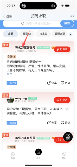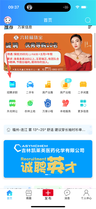 1、在敦化万家首页点击招聘求职选项,进入招聘求职列表页面。