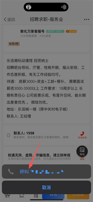 4、在弹窗中点击呼叫按钮,发起与招聘方的电话联系,完成求职操作。