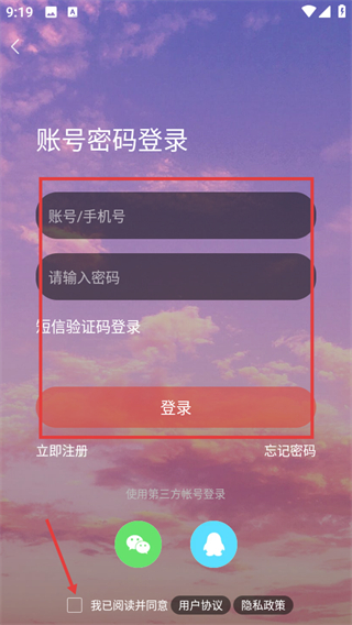4、在登录页面填写账号密码并勾选协议后,点击登录完成操作。