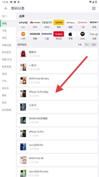 2、在数码分类页,通过品牌苹果、华为等或品类手机、平板筛选,点击具体机型如图中iPhone16ProMax进入详情页。