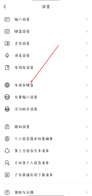 3、进入设置页面后,找到并点击多语言键盘选项。