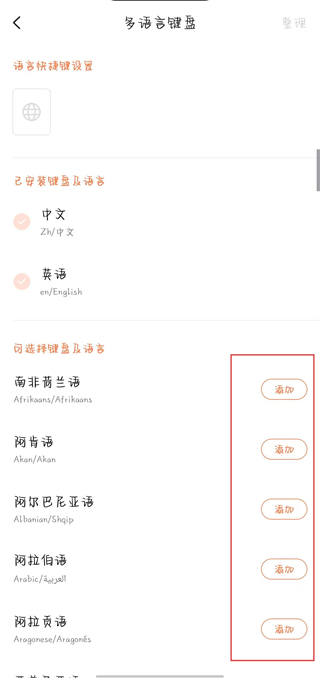 4、在多语言键盘页面,点击想要添加的语言右侧的添加按钮。