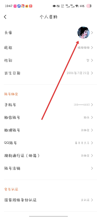3、在个人资料页面中,点击头像选项,弹出选择来源的菜单。