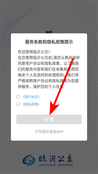 1、打开临沂公交,弹出弹窗后,依次勾选相关协议,点击同意,进入首页。