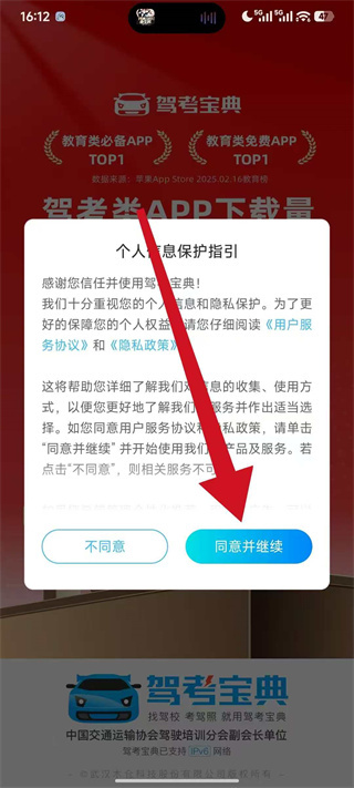 1、打开驾考宝典,进入后弹出弹窗,点击同意并继续,进入应用首页。