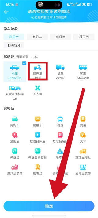 4、在题库页面的驾驶证分类下,选中摩托车选项,点击页面底部的确定,即可完成切换。