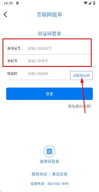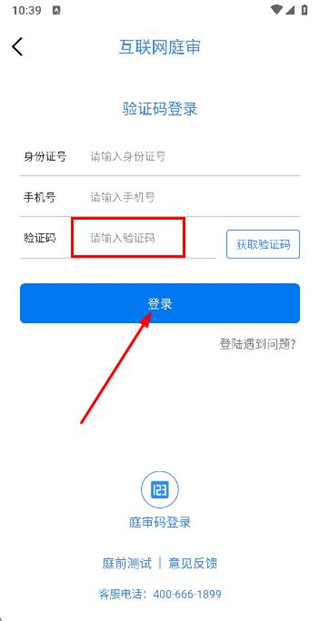3、在验证码登录页面输入验证码后,点击登录按钮完成互联网庭审的登录操作。