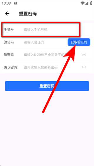 2、在重置密码页面,输入手机号码,点击获取验证码。